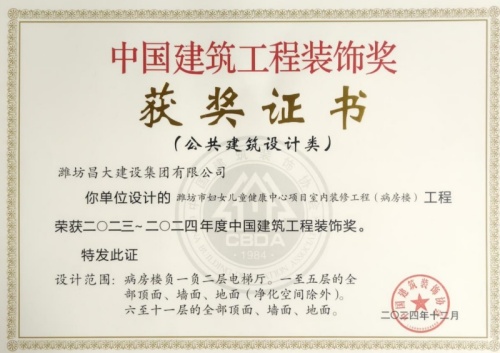 2024年12月10日,中國建筑裝飾協會在北京召開大會,表彰2023~2024年度“中國建筑工程裝飾獎”工程。集團裝飾幕墻工程公司、山東鳶港裝飾工程有限公司的三項工程榮獲五個獎項:濰坊醫學院附屬醫院教學科研病房綜合樓(建筑幕墻類和幕墻設計類)、濰坊市婦女兒童健康中心病房樓(公共建筑裝飾類和公共建筑裝飾設計類),柒星國際2#住宅樓(建筑幕墻類)。